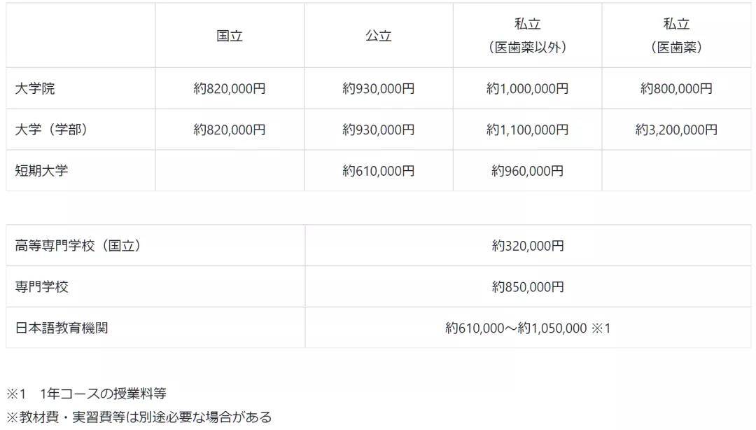 每类学校申请方式,以及学费各有差异。就学费而言,日本的学费较其他国家算是比较低廉的。根据学校类别的不同,学费也有所不同,下面是JASSO(日本学生支援机构)统计的学费情况: