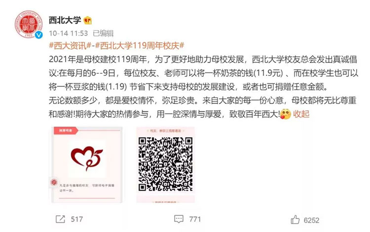 10月14日,在西北大学119周年校庆的前一日,西北大学校友总会在建校119周年之际号召校友、老师及学生每月捐出一杯奶茶或一杯豆浆的钱来支持母校发展。