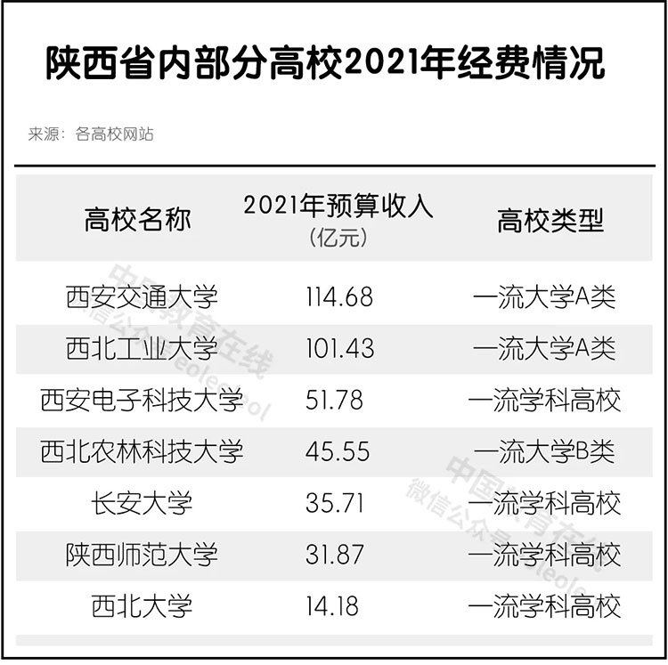 2021年西北大学的经费仅有14.18亿元,虽相较去年增加了5.73亿,但同比陕西其它高校,部属高校西北工业大学拿到的经费超过百亿,西电、西农、长大、陕师大的预算总经费分别为51.78亿元、45.55亿元、35.71亿元、31.87亿元。