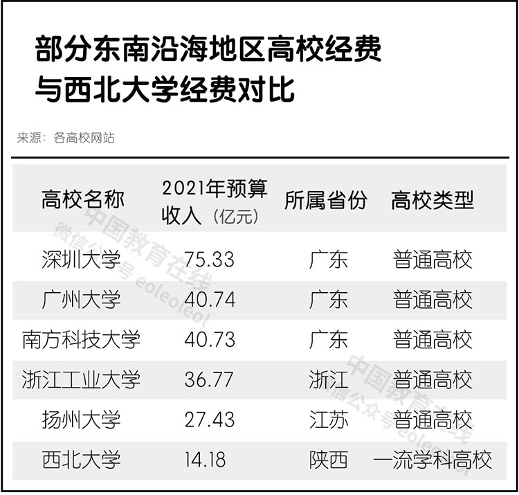 比如深圳大学高达75.33亿,广州大学和南科大都超过了40亿,相较之下,西北大学的14亿经费确实有些辛酸。