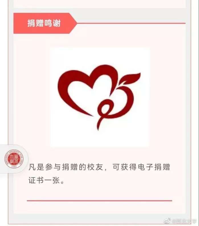 西北大学校方人员表示,小额捐赠是西北大学在广大校友中广泛开展的以自愿为原则的长期性活动。捐款收到之后,捐款明细记录实时公示且有捐赠证书,捐款项目资金使用严格按照学校财务制度使用,并按照学校信息公开制度进行公示。本次倡议也参考了国内其他高校的相关做法。