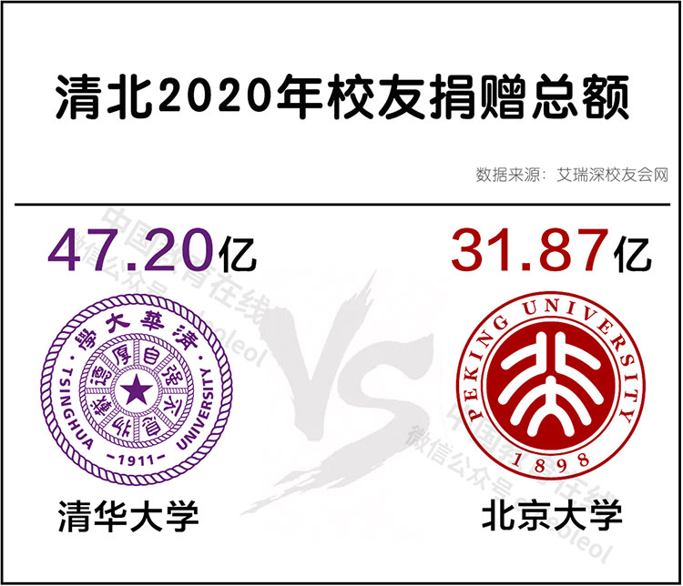 据艾瑞深校友会网统计,1980年至2020年6月,全国高校累计接收校友捐赠总额高达363亿元。2020年,清华大学、北京大学分获校友47.20亿、31.87亿捐赠,其中,清华大学打破中国大学校友捐赠总额最高纪录,这是中国大多学校难以想象的捐赠数额。